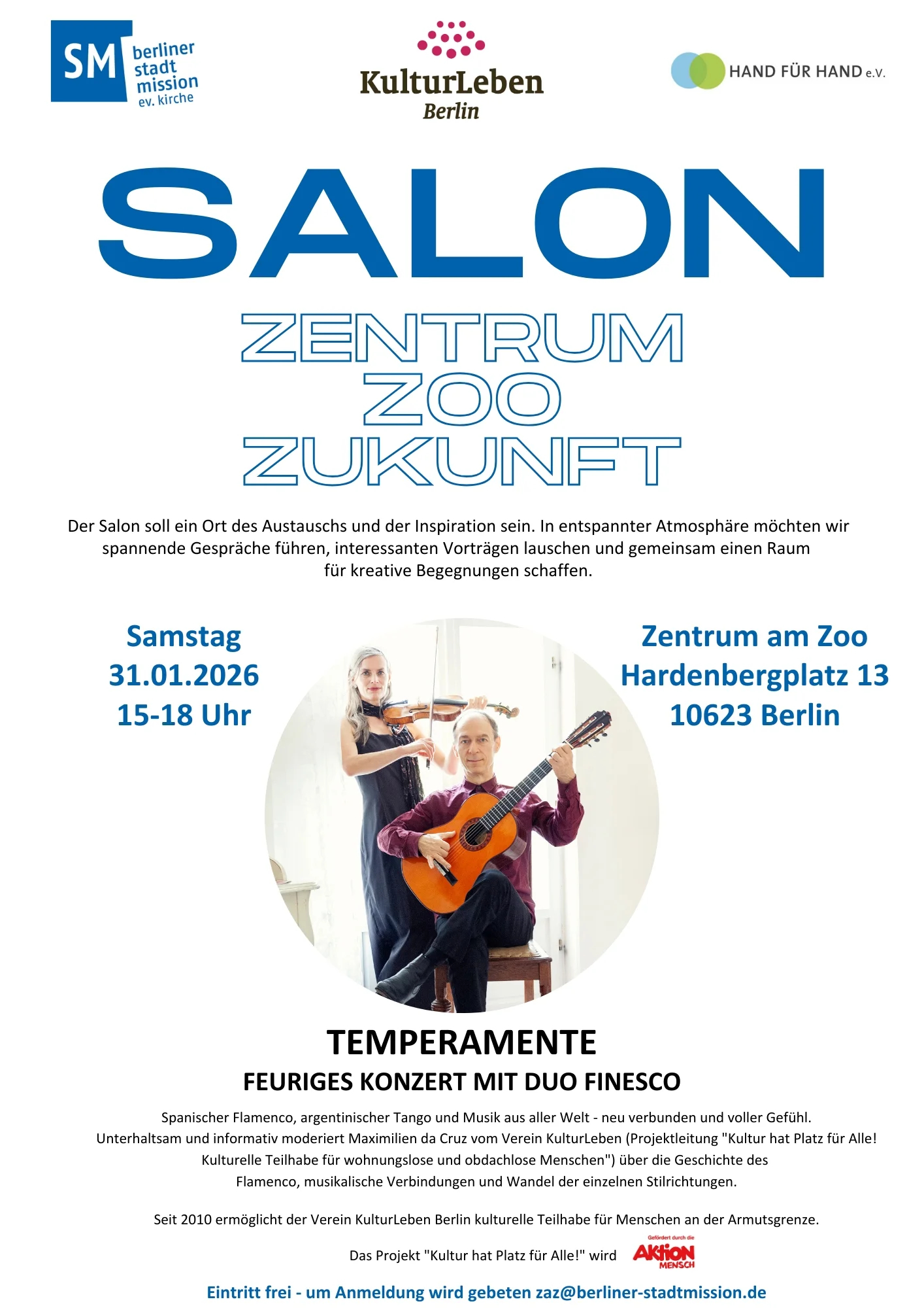 Am 31. Januar 2026 um 15 Uhr organisieren wir mit dem Zentrum am Zoo der Berliner Stadtmission ein ganz besonderes Konzert im Rahmen unseres Projekts “Kultur hat Platz für Alle! Kulturelle Teilhabe für wohnungslose und obdachlose Menschen” (Förderer: Aktion Mensch), mit dem wir obdachlosen und wohnungslosen Menschen kulturelle Teilhabe ermöglichen möchten.