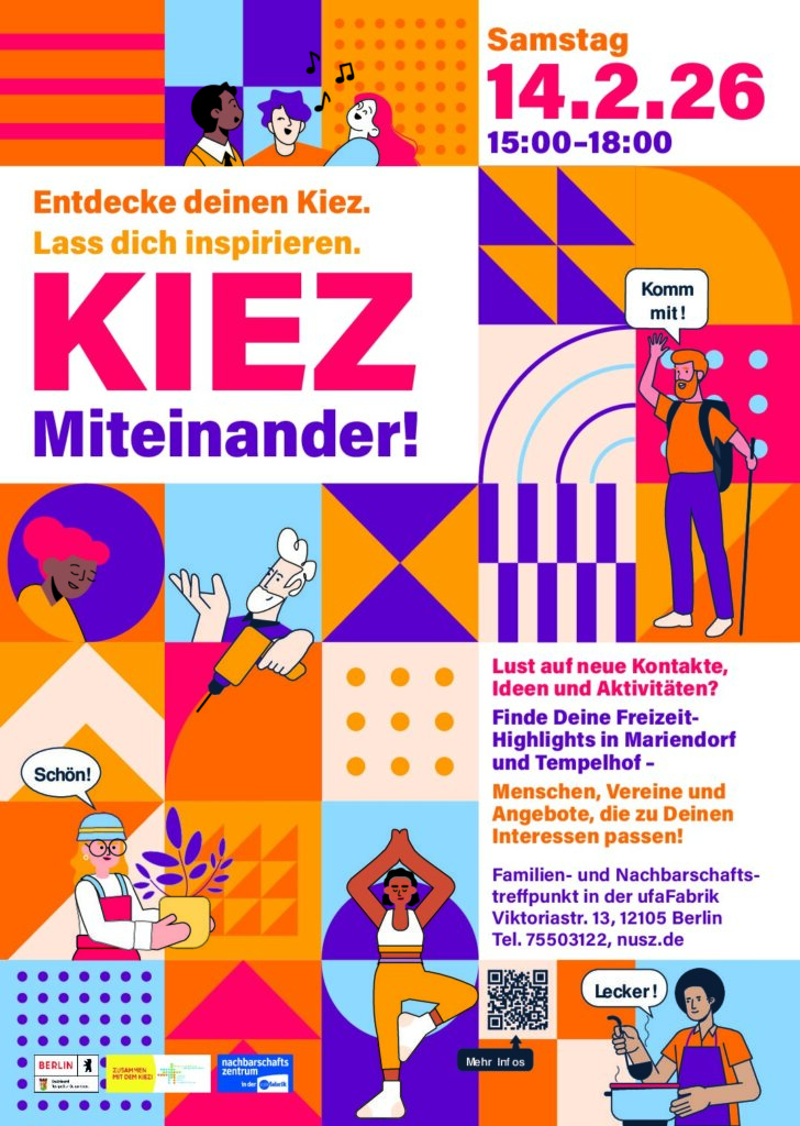 Am 14. Februar 2026 von 15 bis 18 Uhr lädt der Familien- und Nachbarschaftstreffpunkt in der ufaFabrik gemeinsam mit den Regionalkoordinationen für Mariendorf und Tempelhof zum KIEZ Miteinander! ein.